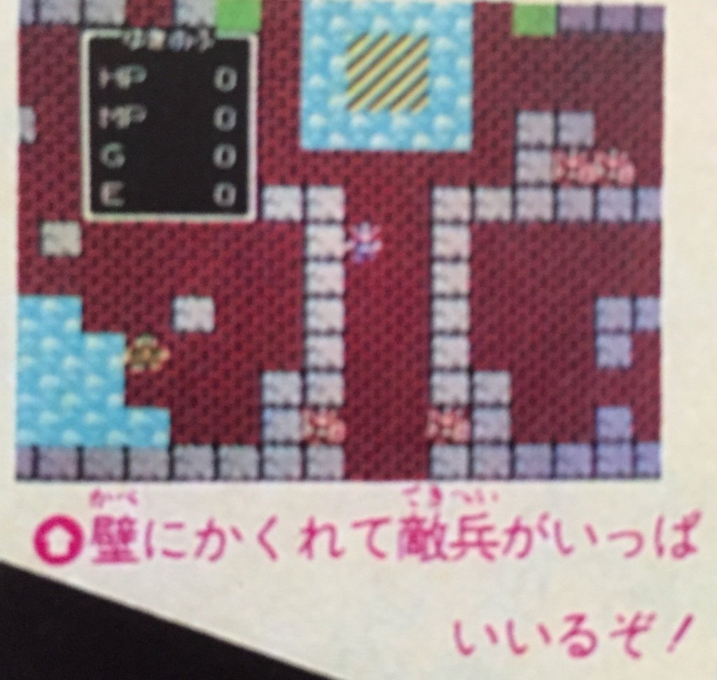 5.《Fami 通》1986 年第 3 期,士兵全身装备(颜色与主角不同 ),视窗中没有等级显示,下方粉色文字“壁にかくれて敵兵がいっぱいいるぞ!”(敌人躲在墙壁后面,数量很多!)