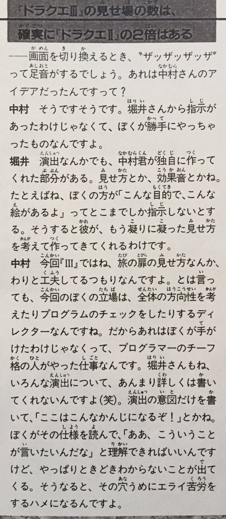 1.在《勇者斗恶龙》系列中,画面切换时会响起的那熟悉的 “嚓嚓嚓嚓” 声。想出这个音效的人,是初期主要开发成员之一的中村光一先生!据说这不是堀井先生的指示,而是他自己构思出来的。(《Fami 通》1988 年第 4 期 )